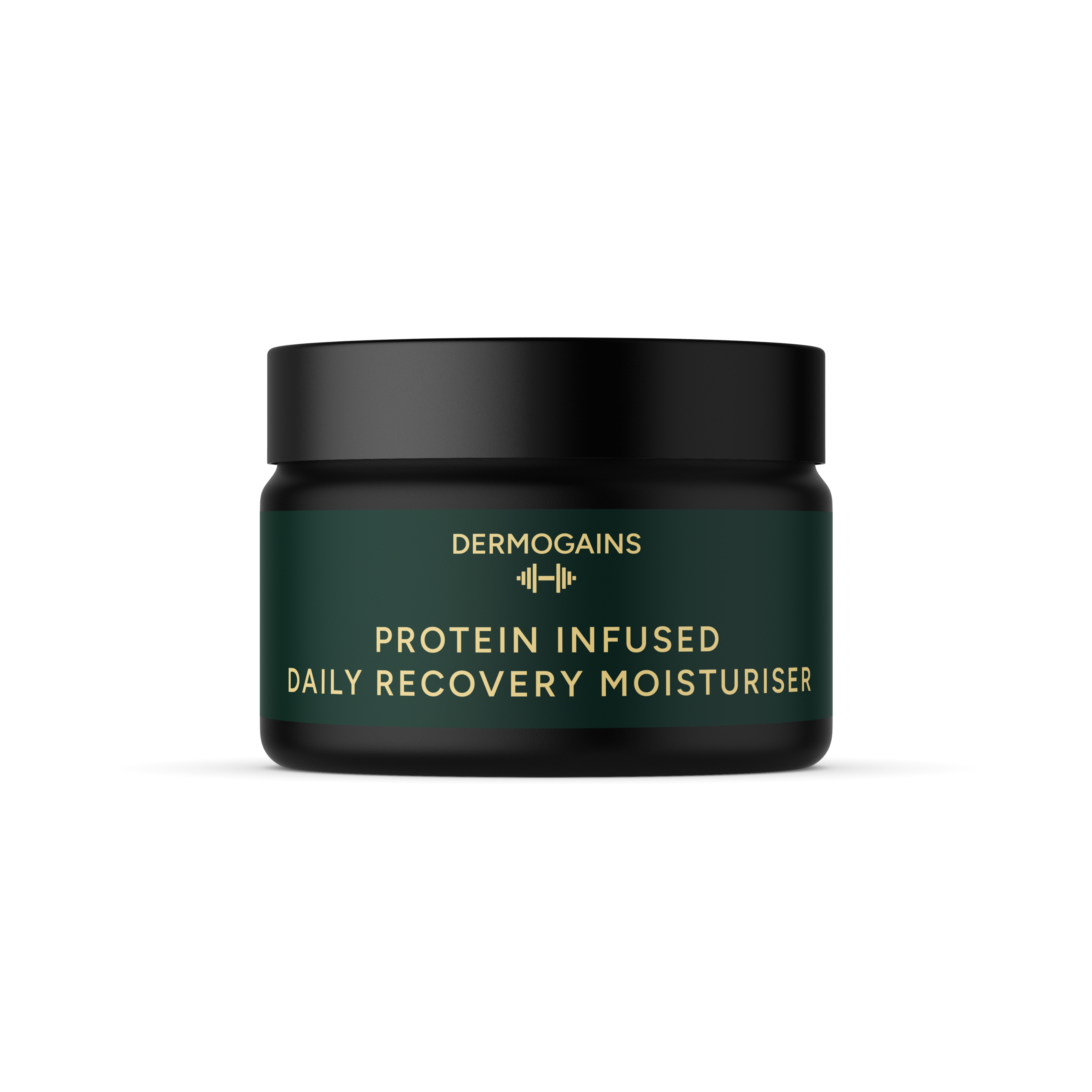 Strength can be refined. Our packaging is matte black with rich, bold label colours—deep green for our Daily Recovery Moisturiser—finished with metallic gold accents. It’s luxe, disciplined, and unmistakably Dermogains™.